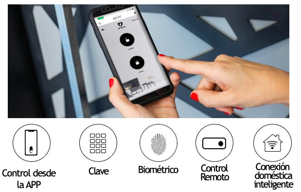 La apertura puede ser por APP exclusiva de RB, clave numérica, huella digital, control remoto, y apertura remota. Adicionalmente, con los dispositivos adecuados, se puede conectar a sistemas centrales de control domótico.